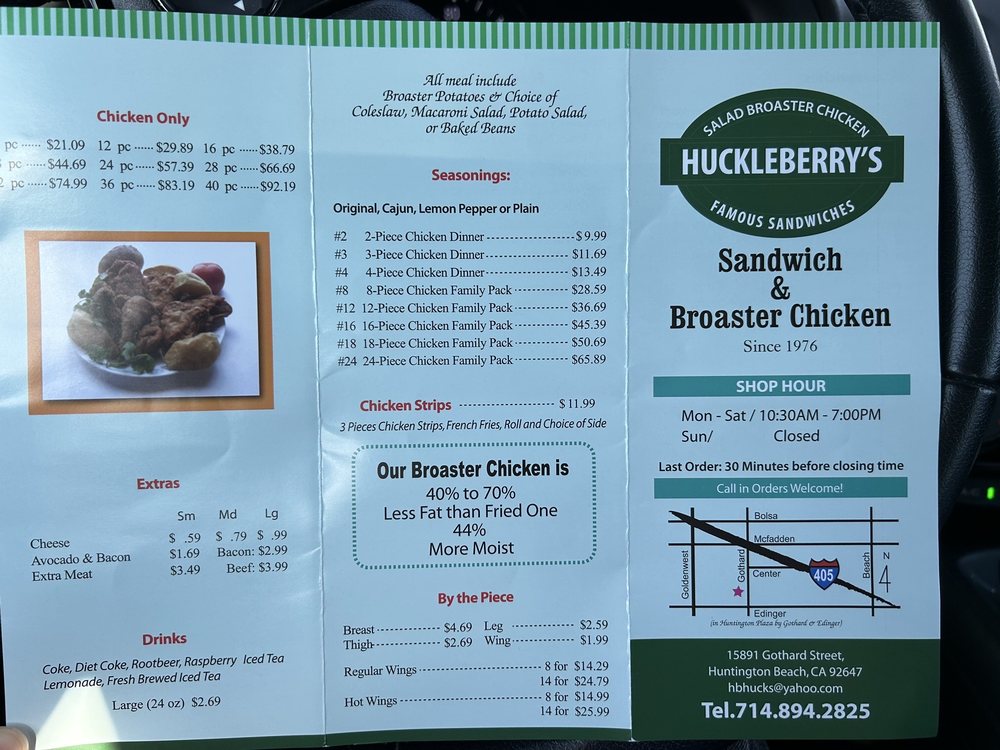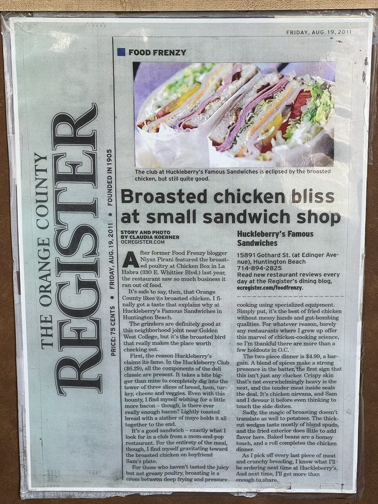 Huckleberry's Famous Sandwiches is a hidden gem located in Huntington Beach, CA, known for their delicious sandwiches and broasted chicken. The menu offers a variety of options, including turkey, roast beef, chicken wings, pastrami, and a Huckleberry Club sandwich. Customers rave about the generous portions, friendly service, and cozy atmosphere. The shop is equipped with amenities like outdoor seating, Wi-Fi, and wheelchair accessibility. Whether you're a meat lover or looking for vegan options, there is something for everyone at Huckleberry's. The broasted chicken is a must-try, and the sandwiches are described as delicious and satisfying. With positive reviews spanning over 35 years, this place is a favorite among families and sandwich enthusiasts alike. Don't miss out on the chance to experience the flavors and hospitality of Huckleberry's Famous Sandwiches.
